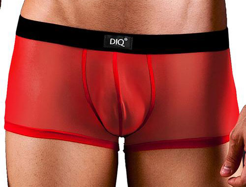 Tease Trunk underwear for men with sheer mesh fabric (see through) with enhancing pouch by DIQ ®. brand. This erotic underwear for men features super smooth and stretchy, sheer, hexagonal micro mesh fabric on the back and sides. The contour pouch on this style is constructed of a super smooth slightly sheer, just enough to give a hint of what lies behind it. It is available in white and red. Both color options feature a black waistband with the DIQ logo. The Tease Trunk style is available in adult men's Small 27"-30", Medium 31"-32", Large 33"-34", XL 35-38", 2XL 39-44". Polyamide elastine. DIQ-4